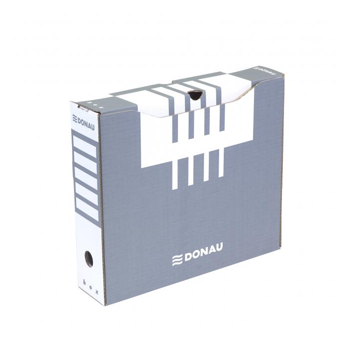 Archívny box z trojvrstvovej lepenky s certifikátom FSC® (drevo na jej výrobu pochádza z lesov, obhospodarovaných udržateľným spôsobom), bez obsahu kyseliny (pH 7,5). Vhodný na archiváciu dokumentov do formátu A4 s otvorom na ľahkú manipuláciu. Možnosť archivovať aj zakladač Donau. Predtlače na popis na dlhšej i kratšej strane umožňuje skladovanie vo vodorovnej aj zvislej polohe. Box je využiteľný samostatne alebo v kombinácii s archivačnými krabicami. Gramáž 390 g. Rozmery 297x80x339mm. Väčšie balenie 20 ks.