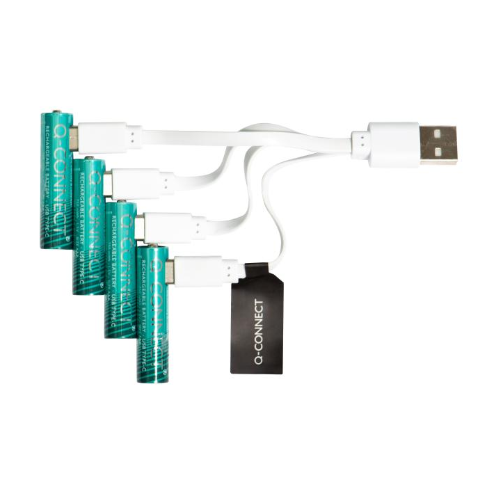 Nabíjteľné AAA batérie Q-Connect, ktoré je možné jednoducho nabiť pomocou pripojenia USB-C, rovnako ako napríklad telefón. Doba doba nabíjania je 2h. Súčasťou balenia sú 4 ks nabíjateľných batérií a 1 ks kábla.