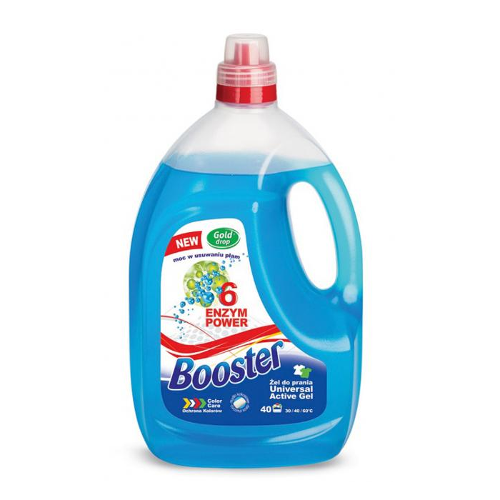 Booster gél na pranie vďaka vhodne zvoleným povrchovo aktívnym látkam hlboko preniká do vlákien tkanín a účinne z nich odstraňuje špinu. Obsiahnuté enzýmy účinne podporujú odstraňovanie škvŕn, o. i. z čokolády a zmrzliny, zosilňujú farebné odtiene a urýchľujú proces prania. Výdatnosť 60 pracích dávok. Objem 3 l.