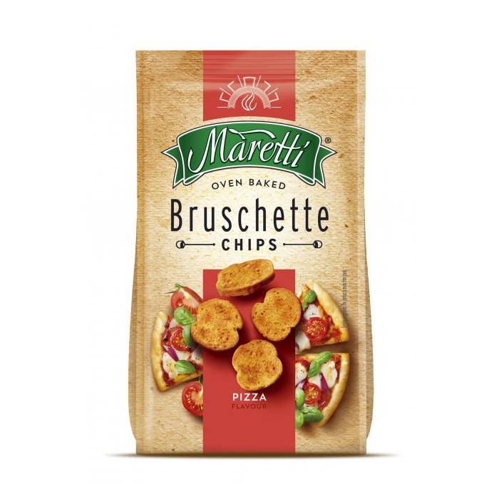 PŠENIČNÁ múka, Rastlinný olej (palmový oleín, antioxidant: extrakty z rozmarínu), Extrudovaná kukuričná múka, Ochucujúca zložka: pizza 5,5% (sušená SRVÁTKA, Jedlá soľ, Zvýrazňovače cuti: glutaman sodný, guanylan disodný, inozinan disodný; Cukor, Paradajkový prášok 7%, SYROVÝ prášok 6,5%, Cibuľový prášok 5%, Sušené oregano, Dextróza, Maltodextrín,