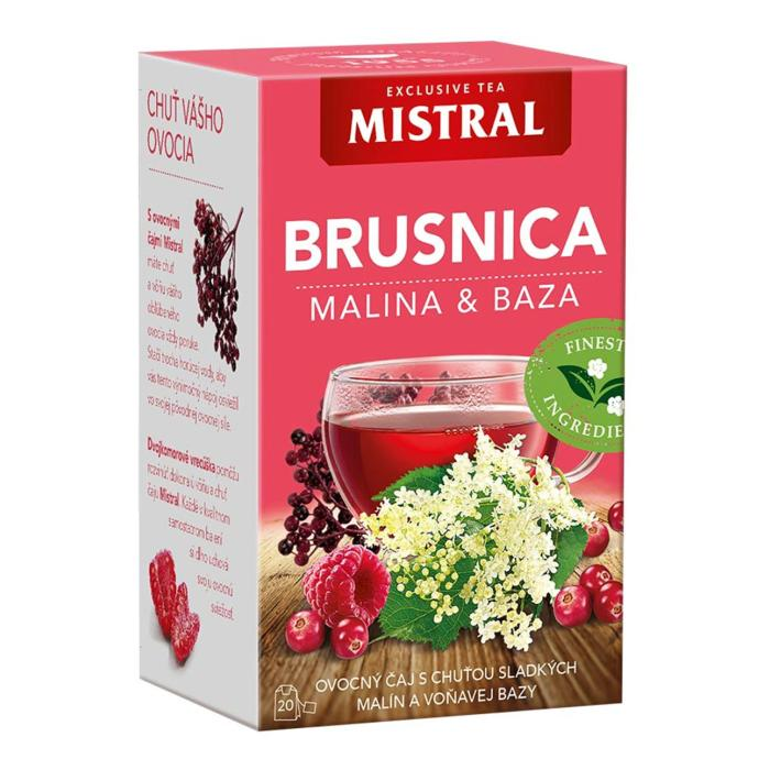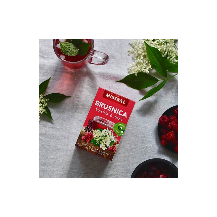 Aromatizovaný ovocný čaj s príchuťou Brusnica, malina, baza čierna. Porciovaný v nálevových vreckách.