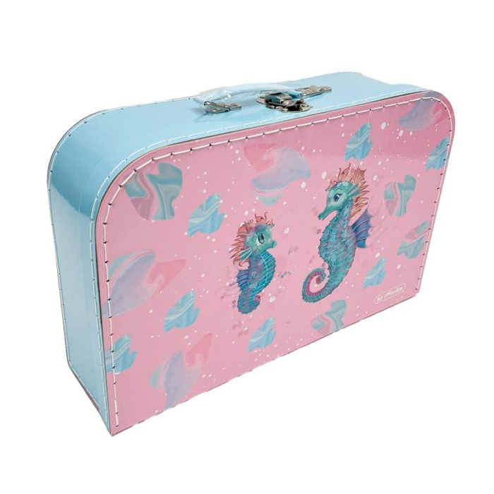 Papierový kufrík na školské pomôcky, lesklý, s vnútornou grafikou, kovové zatváranie. Rozmery: 35 × 23 × 10 cm. Motív: Morský koník.
