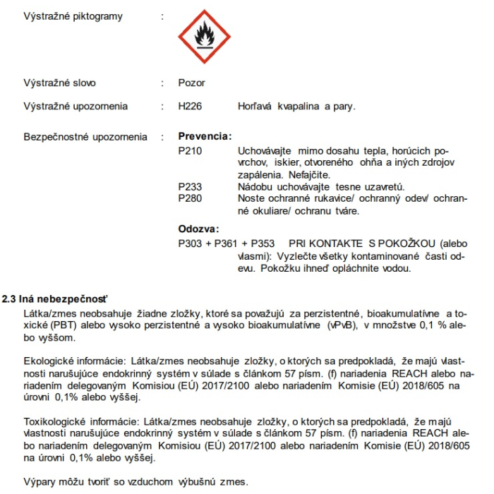 V súlade s nariadeniami 453/2010 a 1272/2008 Klasifikácia v súlade s nariadením 1272/2008 Horľavé kvapaliny (kategória 3). Klasifikácie v súlade s nariadením 1999/45/ES. Informácie na etikete v súlade s nariadením 1272/2008.