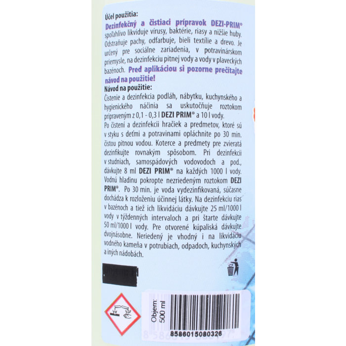 Čistenie a dezinfekcia podláh, nábytku, kuchynského a hygienického náčinia sa uskutočňuje roztokom pripraveným z 0,1-03 l DEZI PRIM a 10 l vody. Po čistení a dezinfekcii hračiek a predmetov, ktoré sú v styku s deťmi a potravinami opláchnite po 30 minútach čistou pitnou vodou. Koterce a predmety pre zvieratá dezinfikujte rovnakým spôsobom. Pri dezinfekcii v studniach, samospádových vodovodoch a pod. dávkujte 8 ml DEZI PRIM na každých 1000 l vody. Vodnú hladinu pokropte nezriedeným roztokom DEZI PRIM. Po 30 minútach je voda vydezinfikovaná, súčasne dochádza k rozloženiu účinnej látky. Na dezinfekciu rias v bazénoch a tiež ich likvidáciu dávkujte 25ml/ 1000 l vody v týždenných intervaloch a pri štarte dávkujte 50 ml/ 1000l vody. Pre otvorené kúpaliská dávkujte dvojnásobne. Neriedený je vhodný i na likvidáciu vodného kameňa v potrubiach, odpadoch, kuchynských a iných nádobách.