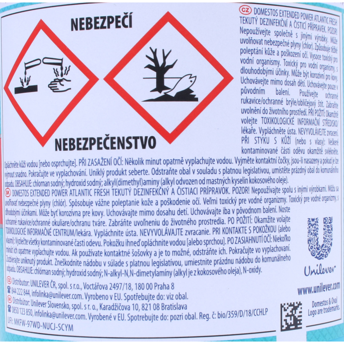 POZOR! Nepoužívajte spolu s inými výrobkami. Môžu sa uvoľňovať nebezpečné plyny (chlór). Spôsobuje vážne poleptanie kože a poškodenie očí. Veľmi toxický pre vodné organizmy. Môže byť korozívna pre kovy. Uchovávajte mimo dosahu detí. Uchovávajte iba v pôvodnej nádobe. Zabráňte uvoľneniu do životného prostredia. Noste ochranné rukavice/ochranný odev/ochranné okuliare/ochranu tváre. PRI KONTAKTE S POKOŽKOU (alebo vlasmi): Všetky kontaminované časti odevu okamžite vyzlečte. Pokožku opláchnite vodou/sprchou. PO ZASIAHNUTÍ OČÍ: Niekoľko minút ich opatrne vyplachujte vodou. Ak používate kontaktné šošovky a ak je to možné, odstráňte ich. Pokračujte vo vyplachovaní. Okamžite volajte TOXIKOLOGICKÉ INFORMAČNÉ CENTRUM/lekára. Zozbierajte uniknutý produkt. OBSAHUJE: chlórnan sodný; hydroxid sodný; N-alkyl-N,N-dimetylamíny (alkyl je z kokosového oleja), N-oxidy.