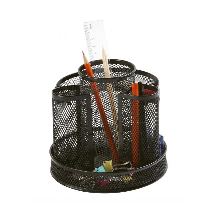 Drôtený organizér s ľahkým prístupom na všetky strany vďaka možnosti otáčania. 4 priehradky na kancelárske potreby, 1 na gumy, sponky, spinky a pod., gumené nožičky. Rozmery (š × v × h) 165 × 165 × 160 mm. Farba čierna.