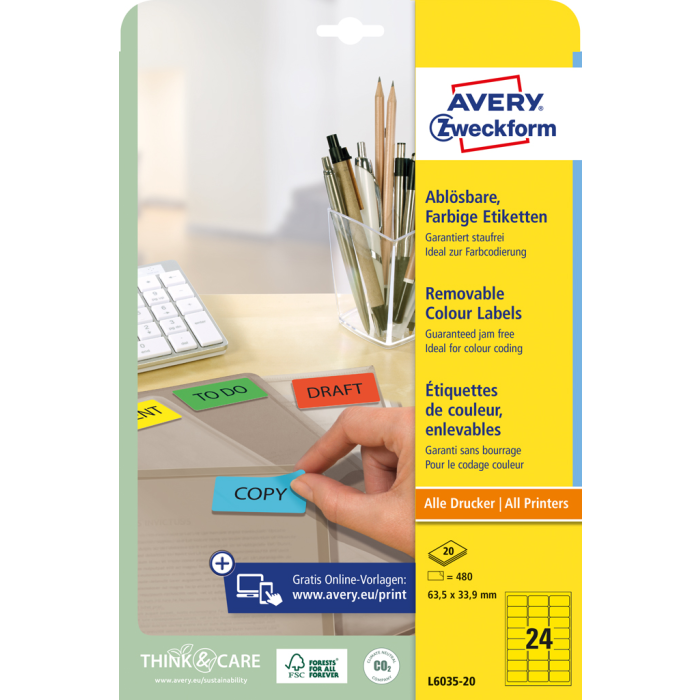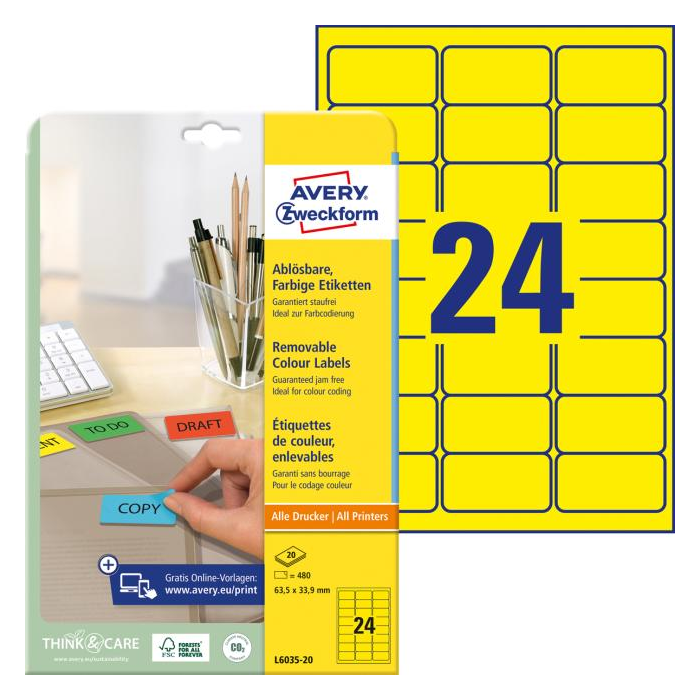Odnímateľné samolepiace etikety STICK & LIFT odlepiteľné a znovu prelepiteľné (na bežnom povrchu až 5×) bez toho, aby zanechali stopy lepidla. Sú vhodné pre všetky druhy tlačiarní a kopíriek. Využiteľné najmä na každodenné pracovné činnosti, ako napr. vytváranie popisov, cenoviek, označovanie výrobkov, majetku a pod. Farba žltá. Etikety na hárku 24 ks. Balenie 20 hárkov. Rozmery 63,5 x 33,9 mm.