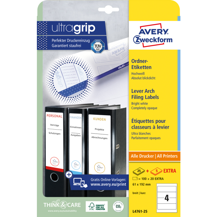 100% krycie papierové etikety na prelepenie neaktuálnych štítkov na chrbtoch zakladačov. Sú vhodné pre tlač vo všetkých druhov tlačiarní a kopíriek. Vďaka inovatívnej technológie ultragrip sa môžete spoľahnúť na bezchybné natiahnutie archu a tlač bez zasekávania. Rozmery v mm : 61 × 192. Farba biela. Etikety na hárku 4 kusy. Balenie 25 + 5 hárkov.