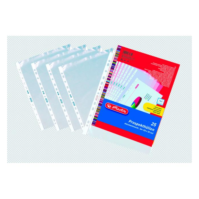 Obaly s eurodierovaním vhodné na zakladanie materiálov rozšíreného formátu A4. Povrch matný. Otvor zhora. Vnútorné rozmery obalu 304 × 220 mm. Balené v sáčku. Hrúbka 100 mic. Balenie 25 ks.