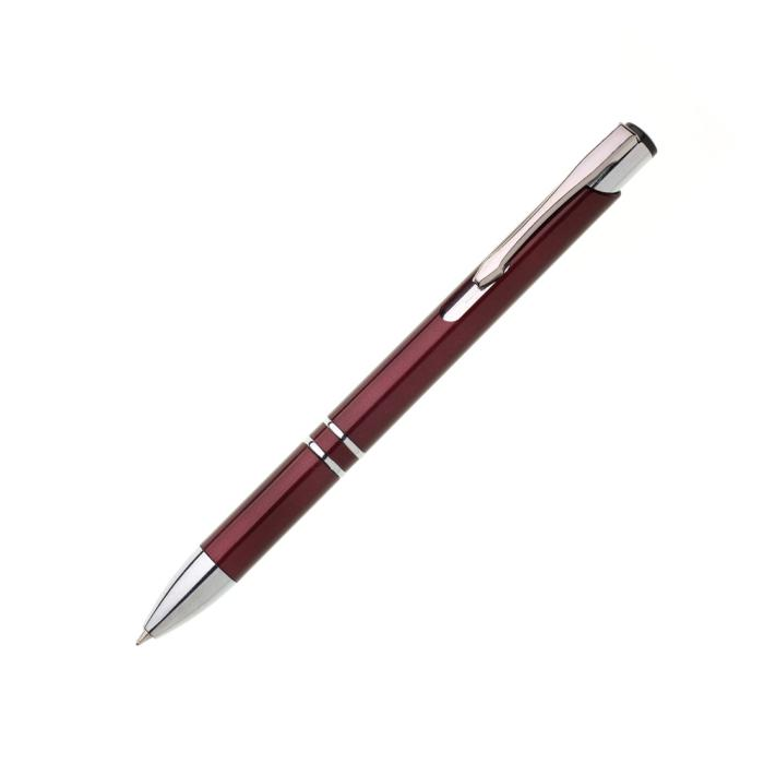 Plastové guľôčkové pero OIRA s kovovými doplnkami. Modrá náplň veľkoobjemová. Farba bordová.