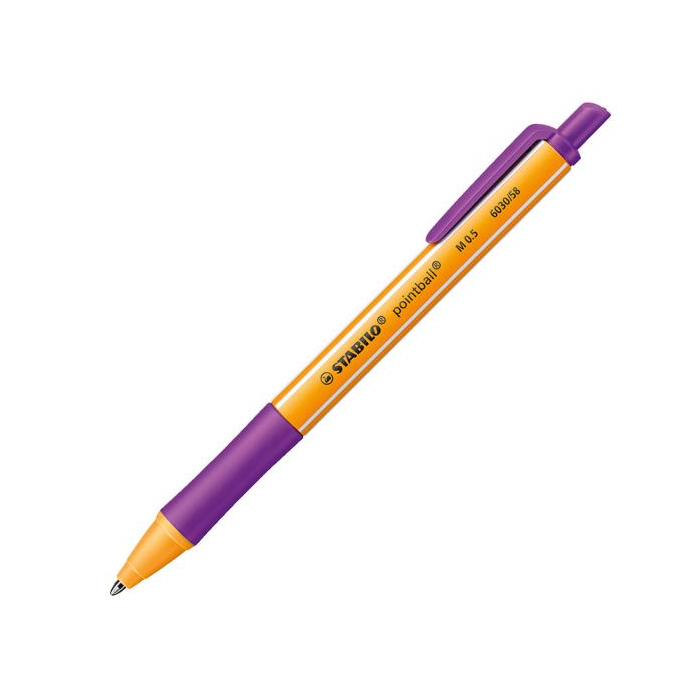 Či už na písanie v kancelárii, v škole alebo na univerzite alebo na písanie poznámok doma, STABILO pointball je vždy tou správnou voľbou. Jeho farebný dizajn v oranžovej farbe s bielymi prúžkami pripomína svetoznámy jemný liner STABILO point 88. Vďaka pogumovanej úchopovej zóne sa guľôčkové pero pohodlne a bezpečne drží v ruke a nekĺže. Mäkká náplň zaisťuje rýchle a plynulé písanie. V záujme ochrany životného prostredia je guľôčkové pero so stláčacím mechanizmom CO2 neutrálne a emisie sú plne kompenzované. Akonáhle je prázdne, môže byť znovu naplnené náplňami STABILO Ballpoint Refill. Je dostupné v šiestich farbách - modrej, čiernej, červenej, zelenej, fialovej a tyrkysovej. Z toho sú farby modrá, čierna a zelená archivačné. Farba tuhy fialová.