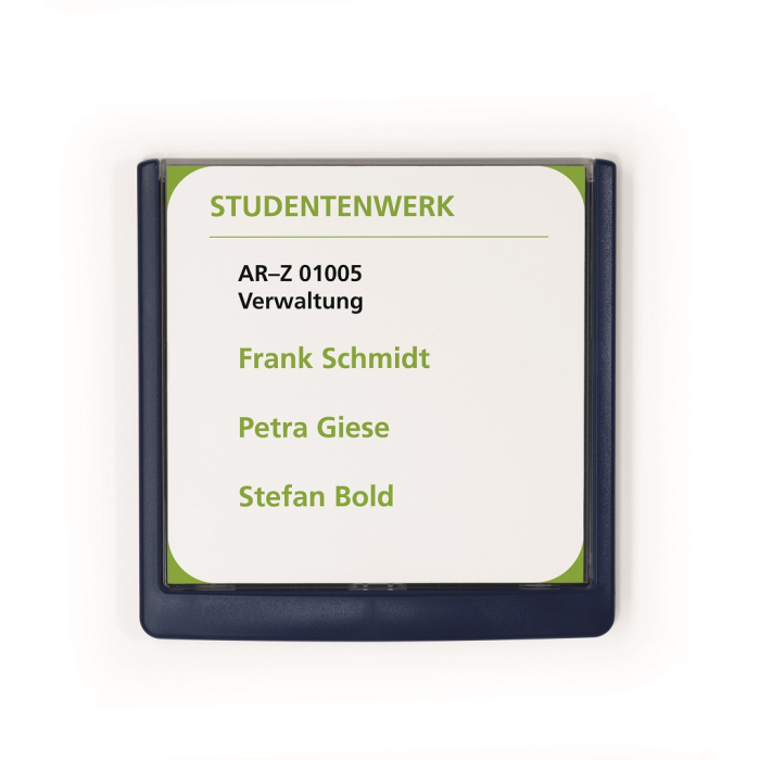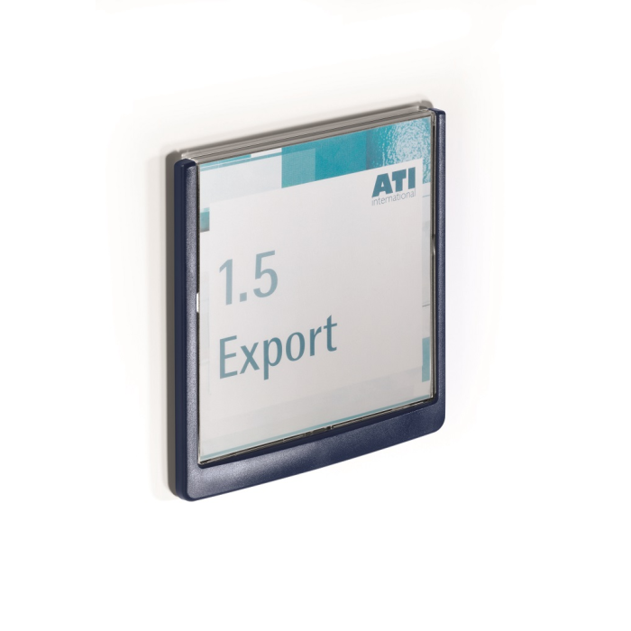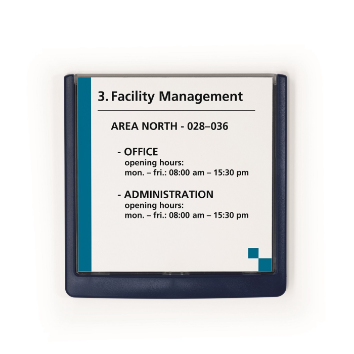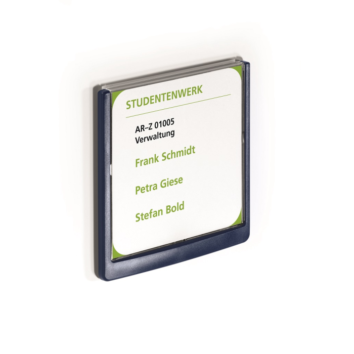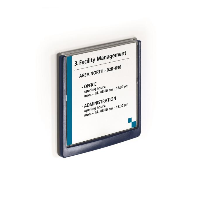 Moderná informačná tabuľka na dvere s lemom v atraktívnej modrej farbe. Predný panel sa otvára na jedno zatlačenie, a tým sa jednoducho sprístupnia vložené popisné papiere, ktoré sa môžu vymieňať podľa potrieb. Tabuľka je ideálna do kancelárií, úradov, škôl, univerzít a hotelov. Súčasťou balenia je montážna sada s názorným návodom. Namiesto pevného montovania môže byť tabuľka k povrchu aj prilepená.
