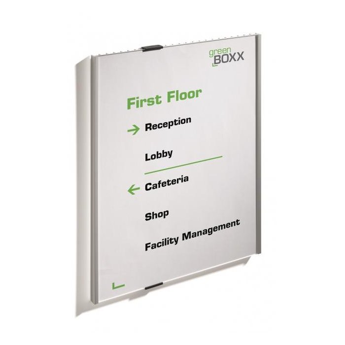 Informačná tabuľka na dvere. Štylizovaná tabuľka vo vrúbkovanej úprave, spodná časť z vysoko kvalitného hliníka, fixujúce spojky v čiernej farbe. K podkladu môže byť zadnou časťou priskrutkovaná alebo nalepená. Text je chránený neoslňujúcim akrylátovým krytom, ktorý pridržiavajú dve fixujúce spojky. Súčasťou balenia je montážna sada s názorným návodom a čistým listom papiera vo veľkosti tabuľky.