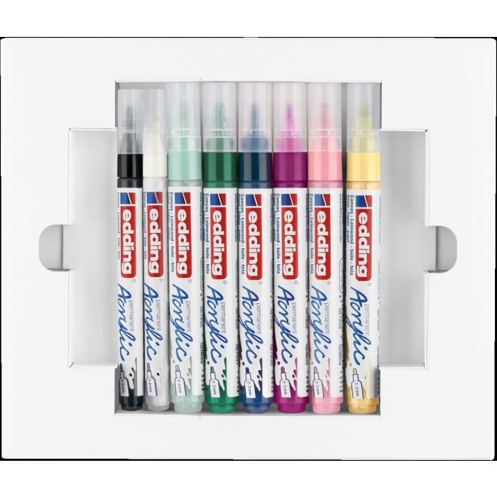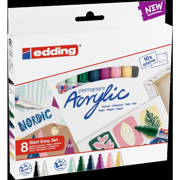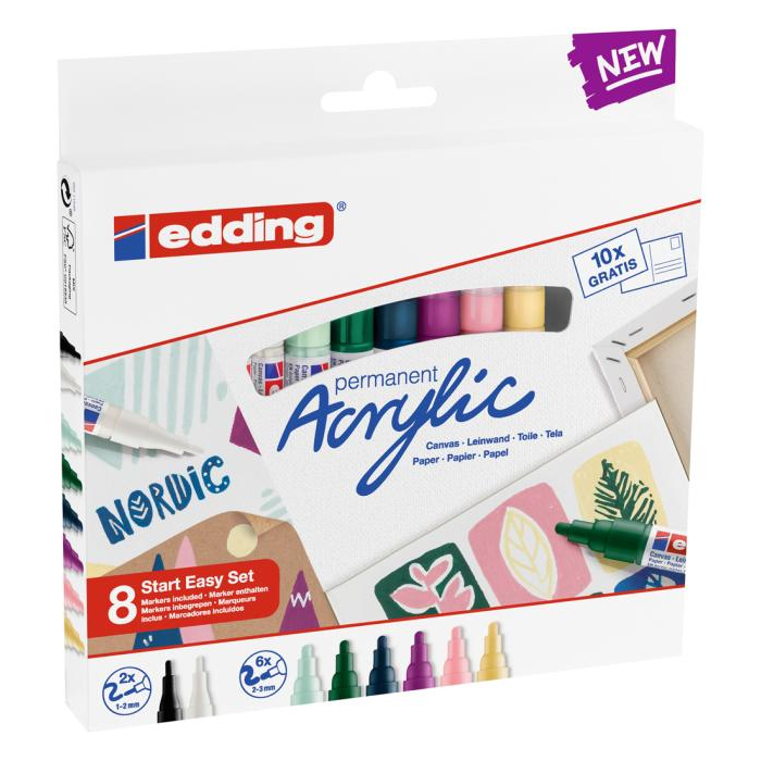 Akrylový popisovač na maľovanie na svetlé alebo tmavé povrchy, ideálny na materiály ako plátno alebo maliarsky papier. Súprava obsahuje 2 akrylové popisovače s tenkým hrotom edding 5300 a 6 akrylových popisovačov so stredne širokým hrotom edding 5100. edding 5300 akrylový popisovač s tenkým hrotom: 1x čierna, dopravná biela. edding 5100 akrylový popisovač so stredne širokým hrotom: 1x sýta mätová, elegantná nočná modrá, klasická slezová, pastelovožltá, purpurová a machovozelená. Vysoko kvalitná pigmentovaná akrylová farba na báze vody je po zaschnutí permanentná, nepriehľadná, svetlostála a bez zápachu. Farby čierna, elegantná nočná modrá, purpurová a machovo zelená sú vysoko krycie. Ostatné odtiene sú polopriehľadné.. Vhodné náhradné hroty (edding 5100 a 5300 náhradné hroty) sú dostupné.