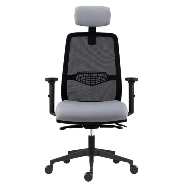 • kancelárska stolička s čiernou sieťovinou na operadle, podhlavníkom a nastaviteľnou bedrovou výstuhou