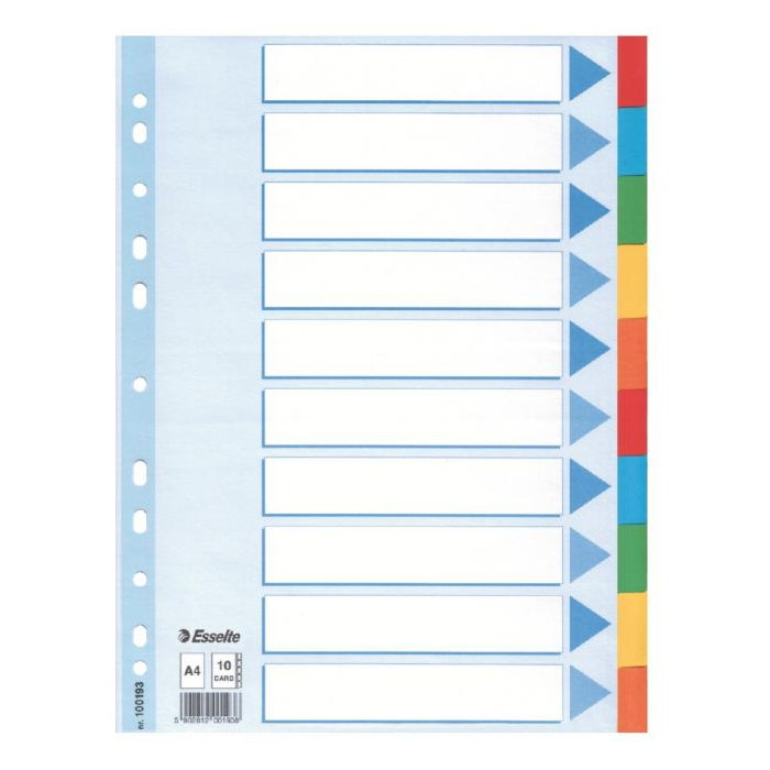 Celofarebný rozraďovač Esselte vyrobený z kartónu v rôznych farbách. Formát A4, eurodierovanie, popisovateľný titulný list na jasnú identifikáciu obsahu. Balenie jedna sada v polyesterovom sáčku. Väčšie balenie 10 sád.