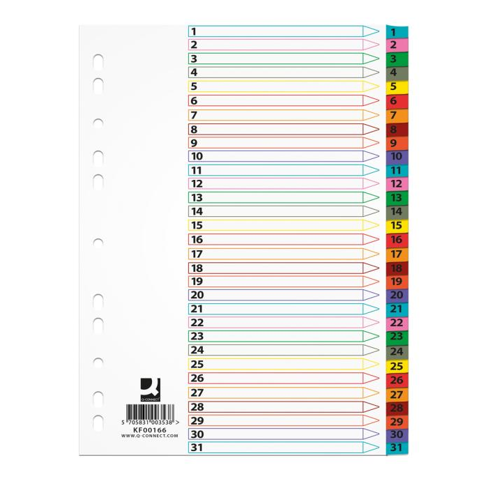 Číselné rozraďovače A4 s laminovanými indexami. Farebné plastové rozlišovacie okraje, popisovateľný biely titulný list s farebnou potlačou na jasnú identifi káciu obsahu. Balenie jedna sada v polyesterovom sáčku. Materiál kartón gramáže 170 g.