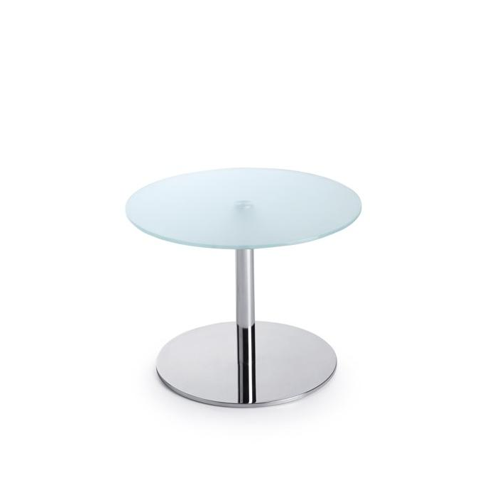 Minimalistický stolík SR 40 je navrhnutý s okrúhlou doskou, vyrobenou z tvrdeného mliečneho skla s hrúbkou 10 mm.