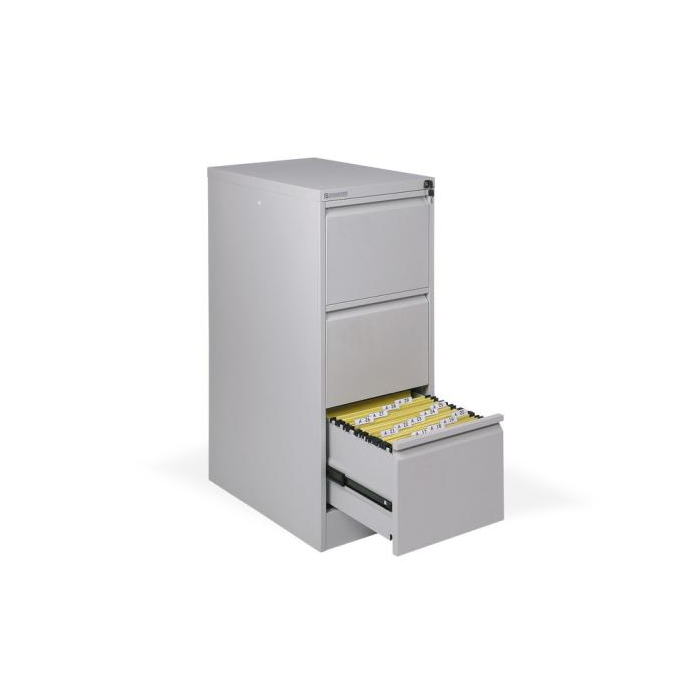 Celokovové kartotéky určené na zkladanie dokumentov A4 v závesných obaloch. Presné teleskopické vedenie na guličkových ložiskách pre ĺahký a tichý chod zásuviek, zariadenie proti preváženiu (nemožno vysunúť viac zásuviek súčasne), vyvŕtané otvory pre prípadné spojenie s ďalšou kartotékou v rade. Zaťaženie zásuvky 40 kg, centrálne uzamykanie, mechanizmus zabraňujúci vypadnutiu zásuvky. Vnútorný rozmer zásuvky (š x v x h) 325x245x530 mm. Hladká povrchová úprava vypaľovaným lakom v sivom odtieni RAL 7035.