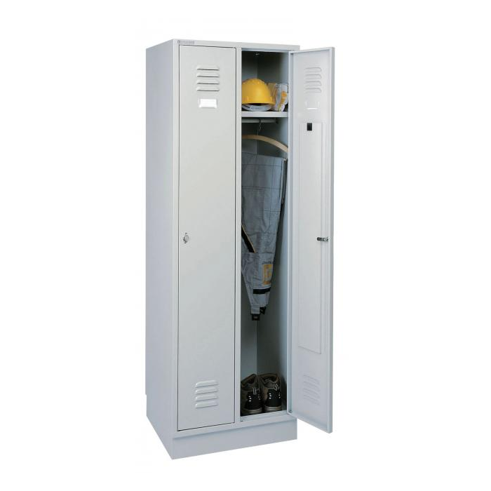 2dielna kovová šatníková skriňa.Šírka každého prvku je 30 cm. 1 polica, pod ňou tyč s posuvnými háčikmi.Vetracie otvory vo dverách.Rámčeky pre umiestnenie štítku.Otočný uzáver pre visiaci zámok.