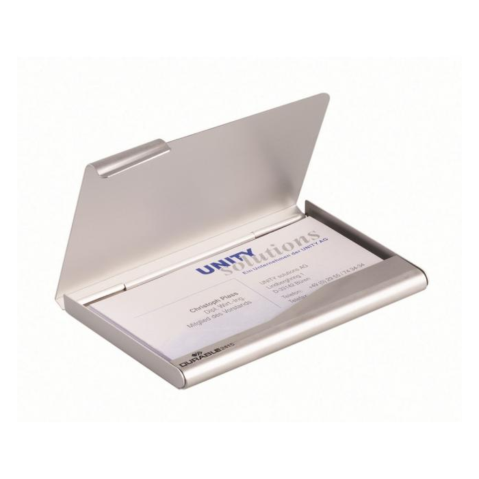 Elegantná a praktická hliníková krabička na vizitky v matnej úprave. Vnútorné rozmery 90 × 55 mm. Kapacita 20 vizitiek. Farba strieborná.