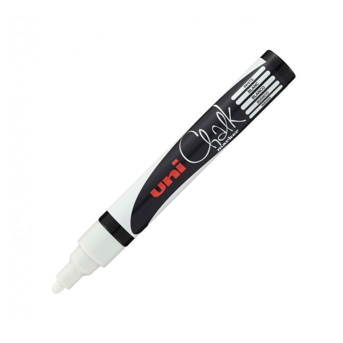 Kriedové popisovače s možnosťou použitia pre priemysel, dekoráciu, informačné tabule a hobby. Na čistých a odmastených neporéznych povrchoch text po zaschnutí odoláva vode a UV, ale je stierateľný vlhkou handričkou. Vhodné na okná, zrkadlá, kovové a plastové povrchy. Hrot guľatý, šírka stopy 1,8 - 2,5 mm. Farba biela.