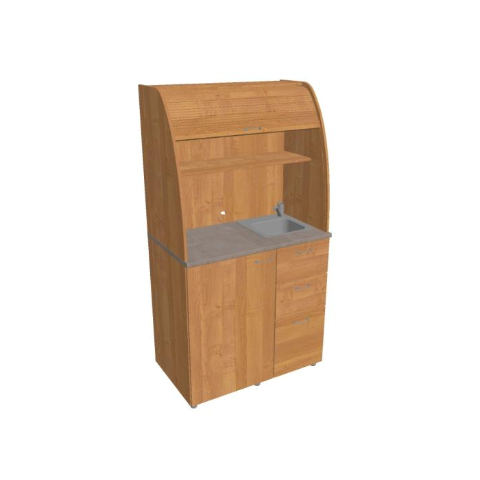 • Dve police vo vrchnej časti kuchynky poskytujú dostatočnú kapacitu na poháre, šálky a taniere. Na pracovnú dosku môžete umiestniť napr. kávovar a káblovou priechodkou v zadnej časti vyvediete kábel z priestoru kuchynky.