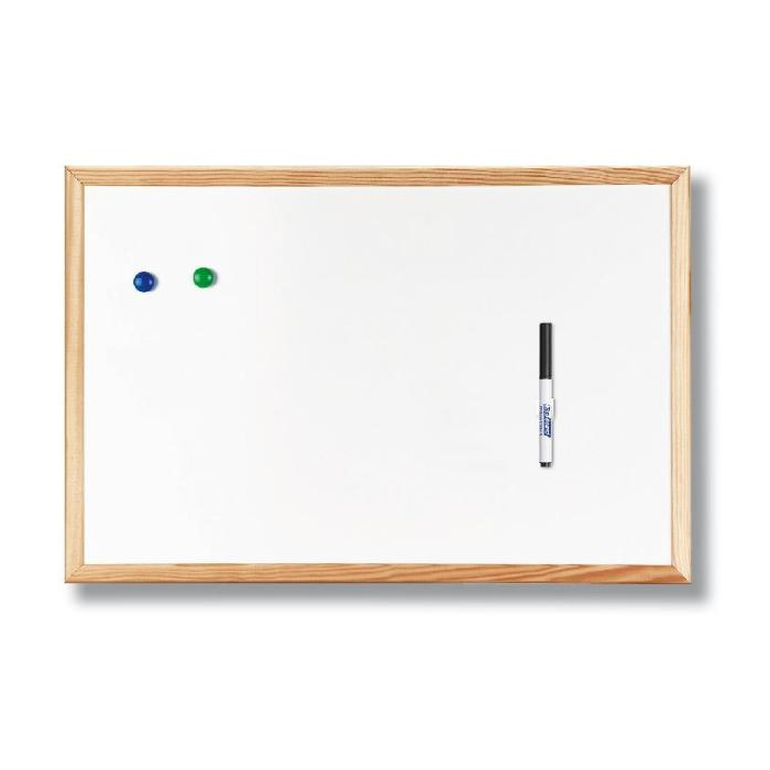 Biela magnetická popisovateľná tabuľa so svetlým dreveným rámom.