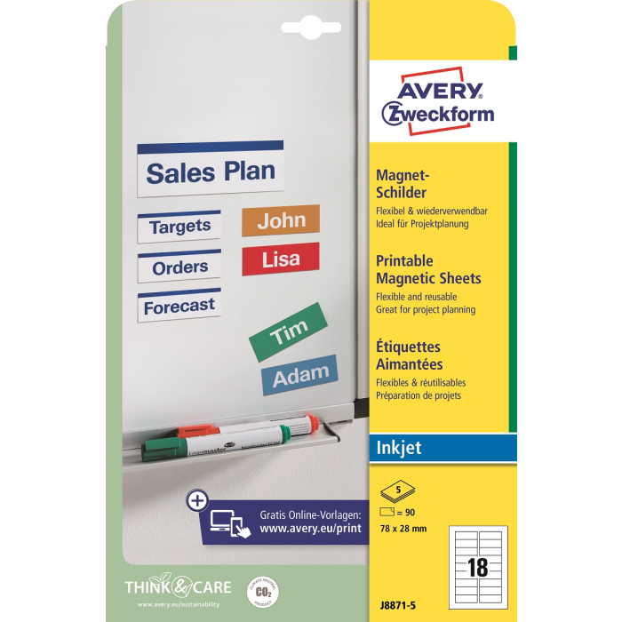 Vytvorte si magnety sami, pomocou vlastného počítača a tlačiarne. Na kovové regály, biele alebo magnetické tabule. Môžete ich ľubovoľne premiestňovať a opätovne používať. Flexiblné a jednoduché označovanie. Mikroperforované. V balení 5 hárkov. Na hárku 18 etikiet.