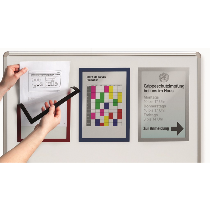 Informačný panel s magnetickou časťou na zadnej strane rámika na jednoduché a rýchle vkladanie informácie formátu A4. Vhodný na hladké magnetické povrchy, napr. magnetickú tabuľu. Farba čiena. V balení 5 ks.