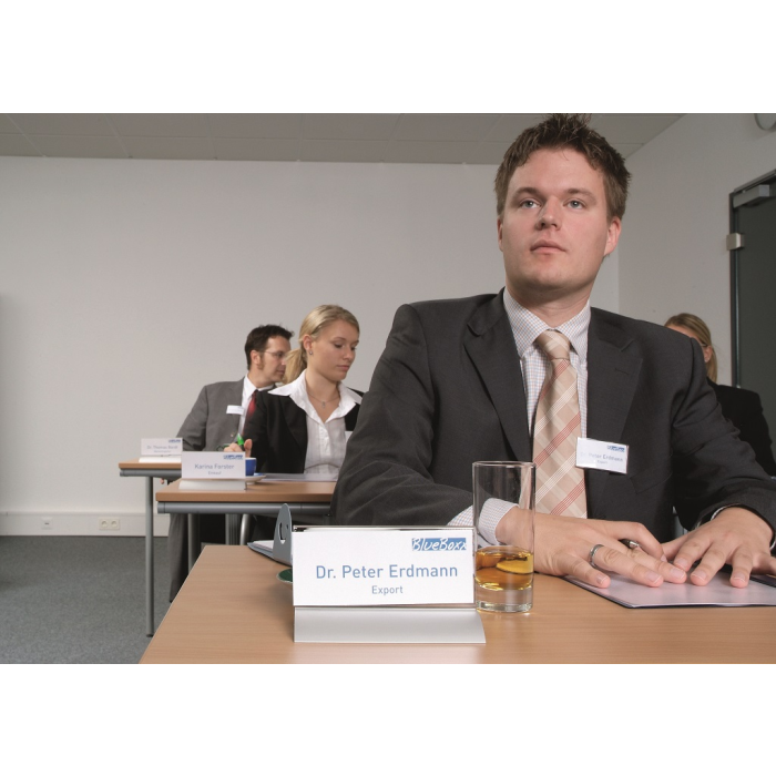 Štýlová stolová menovka s hliníkovým podstavcom. Unikátny uchytávací systém zabraňuje samovoľnému alebo neželanému vysunutiu menovky.Čítanie z oboch strán. Ideálna na konferencie, porady alebo miesta na styk so zákazníkom. Balenie 2 ks.