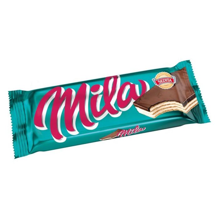 Oblátky polomáčané v kakaovej poleve s mliečnou náplňou (70%) . Hmotnosť 50 g. Väčšie balenie 56 ks.
