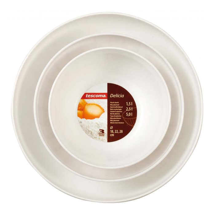Misy z prvotriedneho odolného plastu, vhodné do mikrovlnnej rúry a umývačky. V balení 3 ks - priemer 18, 22 a 28 cm. 3 roky záruka. Dodávané v mixe farieb.