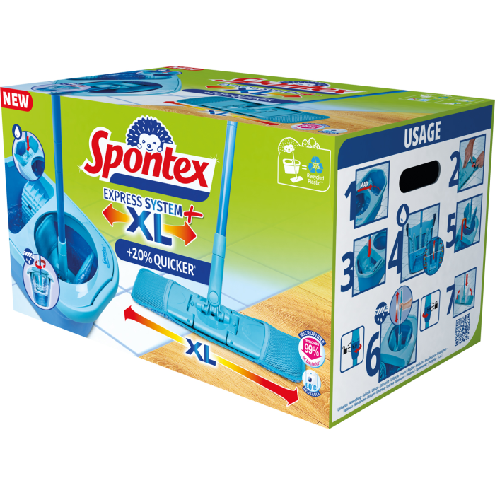 Nový ES+XL plochý systémový mop s väčšou hlavou (dĺžka, nová väčšia časť čistiacej časti +2,5cm väčší pre účinnejšie čisteni. Rovnaké vedro aj okraj. Dlhšia hlava mopu +20%, dlhšie krídla hlavy mopu vs. existujúca hlava mopu +3.1 cm na každej strane, celkovo +6.2cm 65% výrobku vyrobené z recyklovaného plastu.