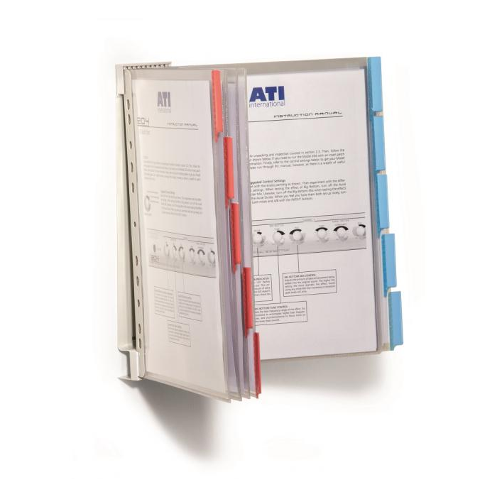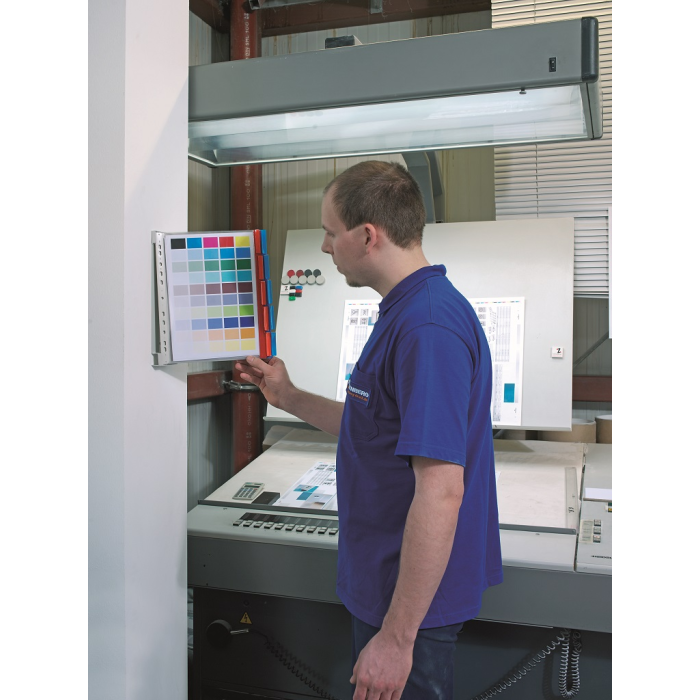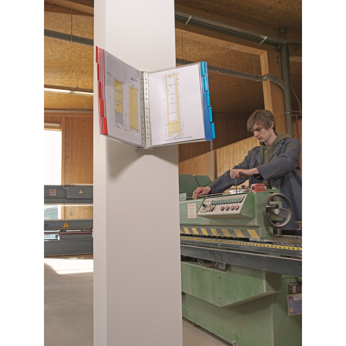 Kovový držiak pre montáž na stenu s 10 displejovými panelmi Funkction. Ideálny pre dielne, výstavné a predajné miestnosti. Farby panelov: po 5 ks z červenej a modrej.