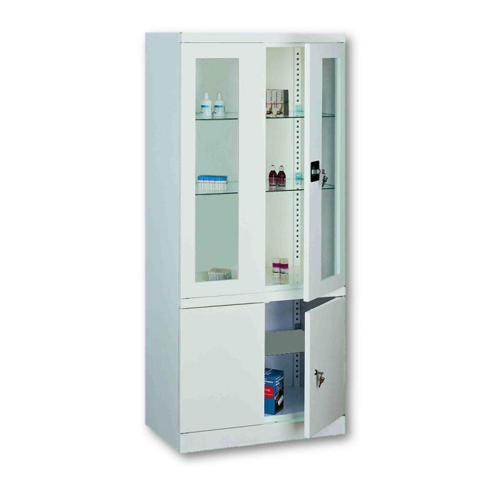 Nemocničná skrinka na lieky je výborným pomocníkom v nemocniciach, lekárňach. Dvere sú presklené s použitím kaleného skla. Skriňa obsahuje 2 sklené police, ktoré sú prestaviteľné po 25 mm, a jednu kovovú policu, ktorá sa nachádza v dolnej časti, vo vnútri uzamykateľnej skrinky. Vitrína je zabezpečená dvojbodovým zámkom s rukoväťou. Na povrchovú úpravu vitrín je použitá prášková farba s vysokou chemickou odolnosťou. Možnosť vyhotovenia aj na kolieskach, za príplatok.