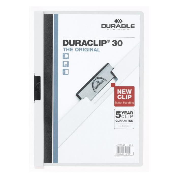 Obal vyvinutý spoločnosťou DURABLE pre viazanie nedierovaných listov. Materiál z PVC s unikátnym kovovým klipom, ktorý sa prispôsobí vloženému počtu listov a priehľadnou prednou stranou. Ideálny na prezentácie, ponuky, správy, poznámky na konferencie, semináre a pod. Formát A4. Kapacita 1-30 listov. Väčšie balenie 25 ks.