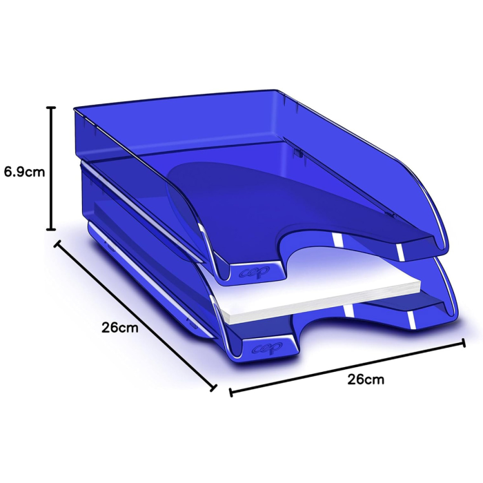 Vďaka štíhlym a elegantným líniám si tento odkladač nájde miesto nielen na stole, ale aj na bočnom stole alebo v skrini. Je vhodný na dokumenty do veľkosti 24 × 32 cm. Široký čelný výrez umožňuje ľahké vyberanie obsahu. Odkladač je stohovateľný vertikálne, aj stupňovito dozadu. Kapacita 450 listov (80 g / m²). Celkové rozmery 257 × 348 × 66 mm. Materiál 100% odolný vysokokvalitný plast. Jednotlivé kusy sa môžu navzájom jemne farebne líšiť. Väčšie balenie 10 ks. Farba transparentná modrá.
