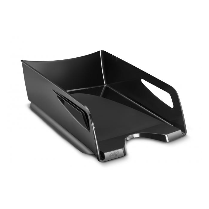 Elegantný, praktický a veľmi robustný široký odkladač na veľké dokumenty. Široký čelný výrez na ľahké vyberanie obsahu, dve bočné držadlá. Vertikálne stohovanie alebo stohovanie stupňovito dozadu. Materiál recyklovateľný polystyrén odolný voči nárazom. Rozmery 365 × 387 × 115 mm. Väčšie balenie 6 ks. Farba čierna.
