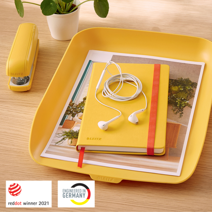Značková kolekcia Leitz Cosy vám umožní cítiť sa ako doma, nech už vás váš pracovný deň zavedie kamkoľvek. Vďaka minimalistickému dizajnu a lákavej matnej povrchovej úprave pridáte svojmu pracovnému priestoru štýl a farbu. Vďaka zásobníku Leitz Cosy môžete mať dokumenty usporiadané a na dosah ruky, vhodné pre formáty až A4. Tento zásobník na dokumenty je perfektným doplnkom vášho domova alebo kancelárie, poriadok v dokumentoch vám pomôže pracovať oveľa efektívnejšie. Vhodné na ukladanie papierov, časopisov a dokumentov veľkosti A4 a C4 vo formáte folio aj letter. Zásobníky možno stohovať (max. 3 zásobníky, ktoré možno zakúpiť samostatne) pomocou dodávaného štýlového červeného stojanu. Farba žltá.