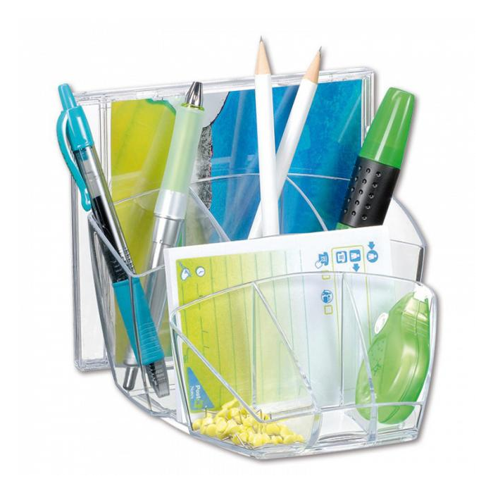 Dômyselne navrhnutý kompaktný a elegantný stolný organizér na kancelárske príslušenstvo. Kapacita: 40 pier, 5 zvýrazňovačov a 3 všeobecné priehradky. Na spodnej časti protišmyková podložka. Celkové rozmery 143 × 158 × 93 mm. 100% recyklovateľný, vysokokvalitný plast. Väčšie balenie 6 ks. Farba transparentná číra.