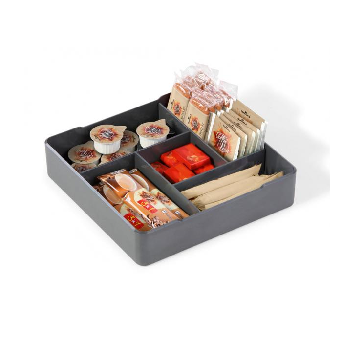Praktický pomocník pri servírovaní občerstvenia. Dizajn zameraný na aplikáciu oddelených priestorov, kde si nájde svoje miesto porciovaný cukor, miešadlá, lyžice, špáradlá, smotany do kávy, obrúsky, drobné pochutiny ku káve a čaju, čajové vrecká. Materiál vysokokvalitný plast, možnosť umývania v umývačke. Rozmery (š × h × v) 210 × 210 × 48 mm. Farba čierna.