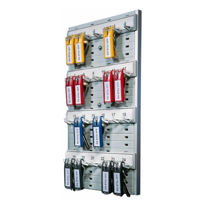 Dokonalý organizačný systém na kľúče bez dokupovania ďalších doplnkov s jednoduchou montážou na stenu. Panel umožňuje pohodlný a priamy prístup až k 24 menovkám s kľúčami. Na výšku zaberie iba 40 cm, čím ušetrí miesto. Súčasťou balenia je 6 menoviek na kľúče v rôznych farbách. Farba panelu sivá.