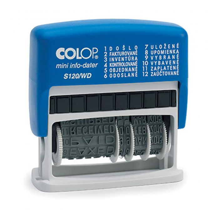 Integrovaná 2-farebná pečiatková poduška modrá/ červená, kde je text modrý a dátum červený. Možnosť výberu z 12 textov: DOŠLO, FAKTUROVANÉ, INVENTÚRA, KONTROLOVANÉ, OBJEDNANÉ, ODOSLANÉ, ULOŽENÉ, UPOMIENKA, VYBRANÉ, VYBAVENÉ, ZAPLATENÉ, ZAÚČTOVANÉ. Náhradná poduška E/12 modrá/ červená.