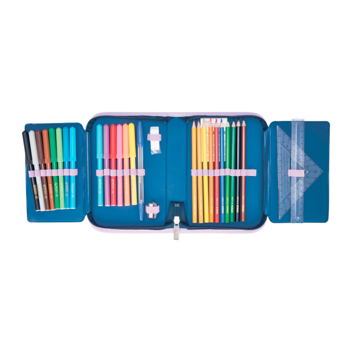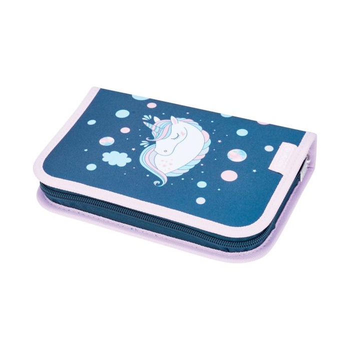 Peračník 2-klopý s výbavou, vnútorná podšívka: farebná. Výbava: 14 fixiek, 8 šesťhranných pasteliek, 2 ceruzky šesťhranné, 1 plastové strúhadlo, 1 guma, 1 plastové pravítko 16 cm, 1 trojuholníkové pravítko, 1 guľôčkové pero, 1 rozvrh hodín, 1 vizitka. Dizajn: Unicorn.