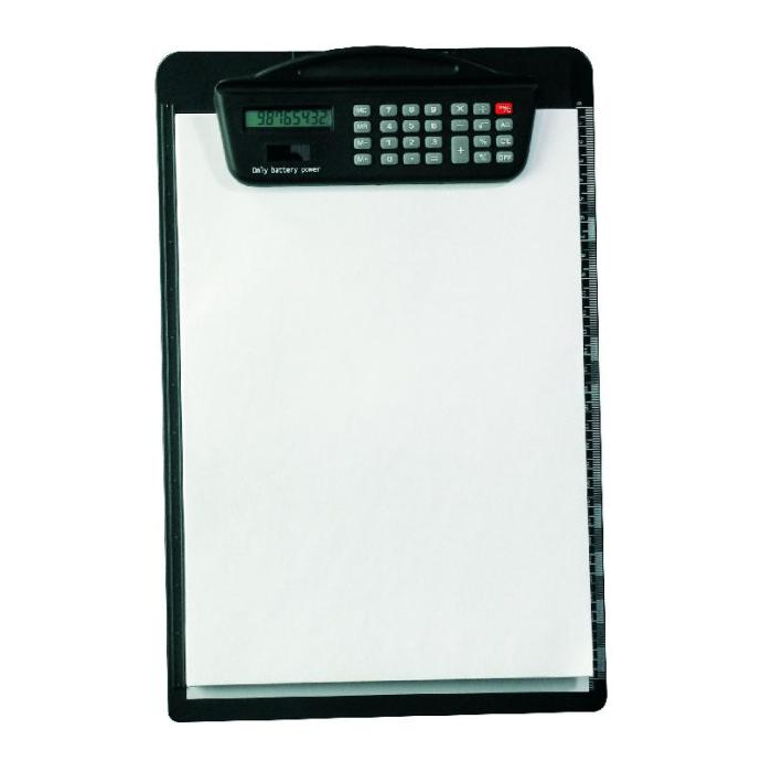 Pevná písacia podložka A4 z tvrdého plastu s kovovým klipom a kalkulačkou, umiestnenou na klipe.