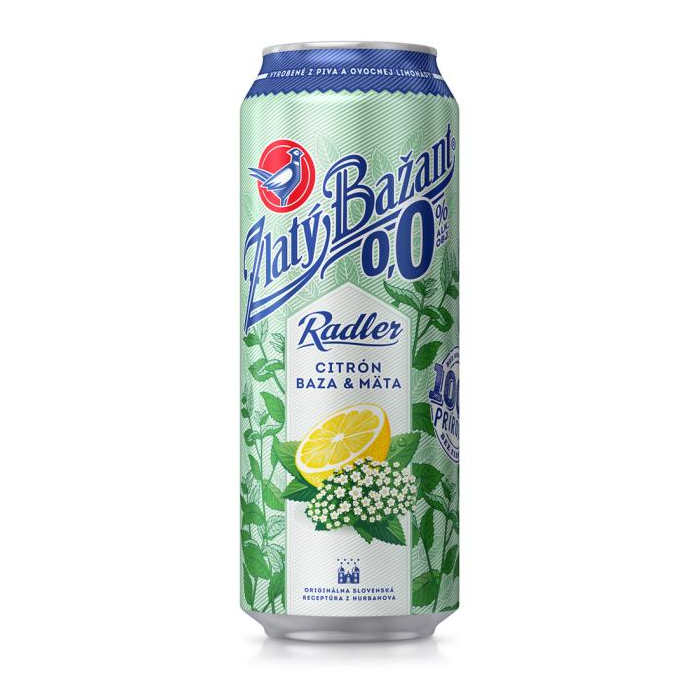 Zlatý Bažant Radler Citrón-Baza-Mäta 0,0%. Miešaný nealkoholický nápoj. Pasterizované.