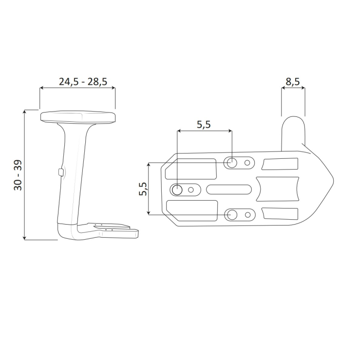 • 2D podrúčky v tvare T s inklináciou vpred o 15 o , materiál plast PP (polypropylén)