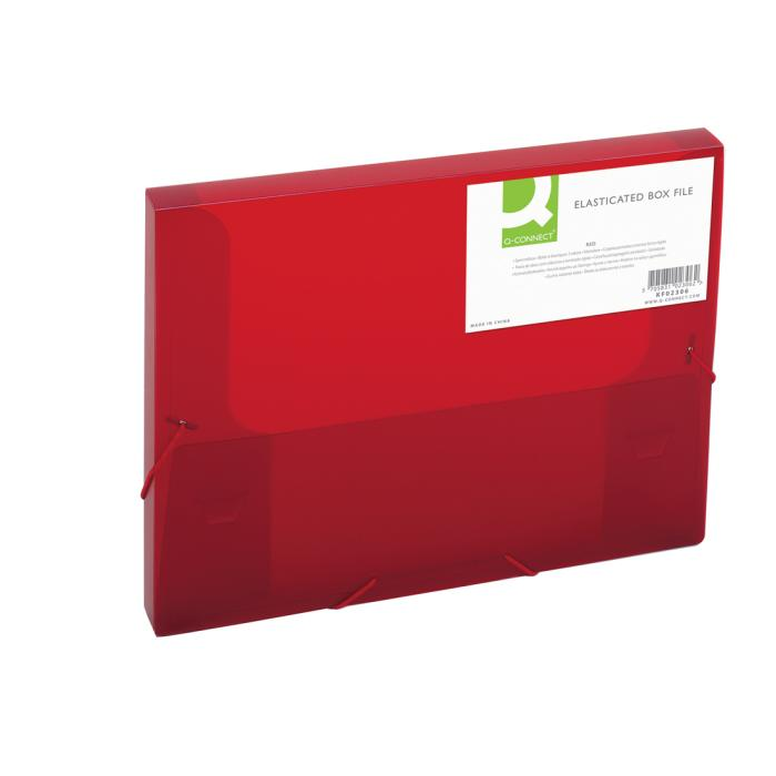 Transparentný plastový box s tromi chlopňami vyrobený z polypropylénu, uzatvárateľný gumičkou. Kapacita 250 listov, šírka chrbta 25 mm. Farba červená.