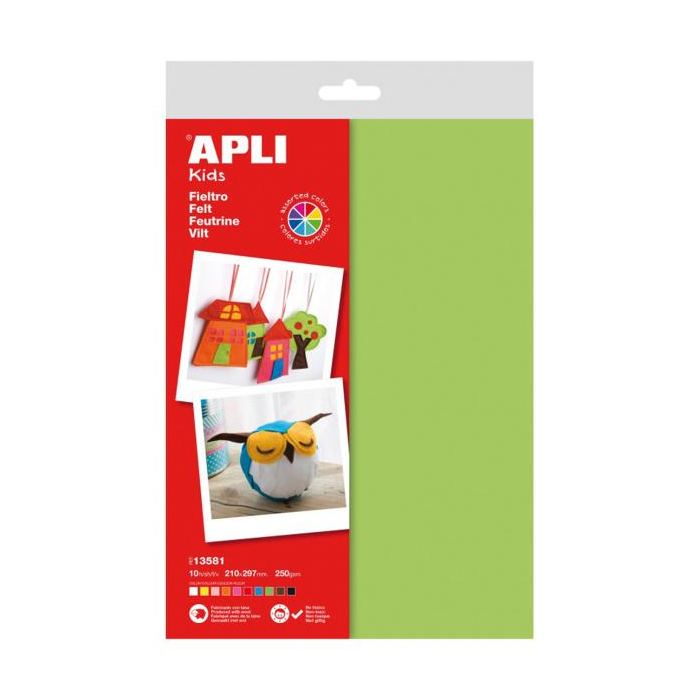 Balenie A4 v rôznych farbách: biela, žltá, telová, oranžová, ružová, červená, modrá, zelená, hnedá a čierna. Každé balenie obsahuje 10 listov (1 na farbu). Plsťové plachty APLI obsahujú 40 % prírodnej vlny a majú hrúbku 250 g/m2, sú teda odolnejšie, mäkšie a ohybnejšie. Jednoduché označovanie, rezanie a lepenie. Ideálne na embosovanie pohľadníc, kariet, pohľadníc, pozvánok, kníh, vrecúšok... alebo na vytváranie postáv, šperkov, klobúkov, bábok, kostýmov, držiakov na mince, rámy, kabelky atď.